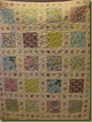 Dette teppet er sydd av 9 x 30 cm stoffer, hovedsakelig fra Free Spirit Fabrics. I tillegg har det gått med nesten 2,3 m hvitt stoff. Teppet vårt er blitt 135 cm x 190 cm, men da har vi en del fargede biter igjen.